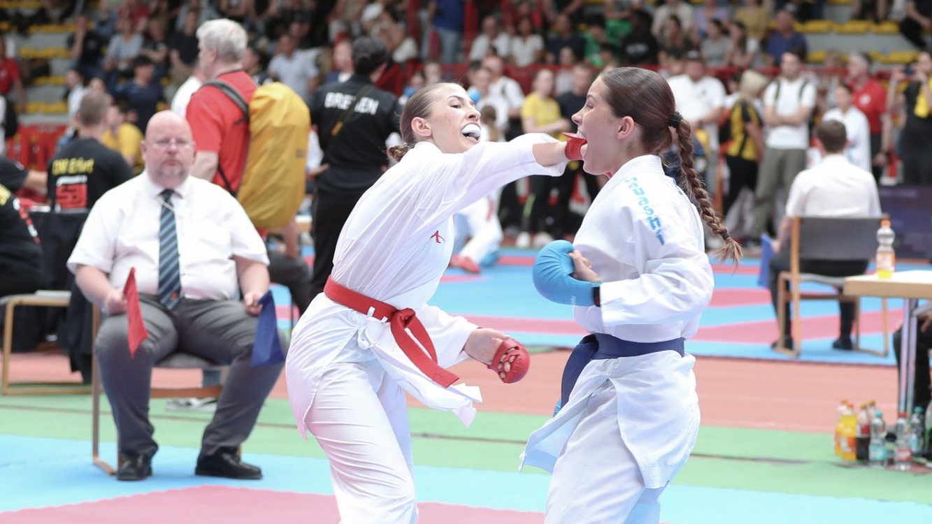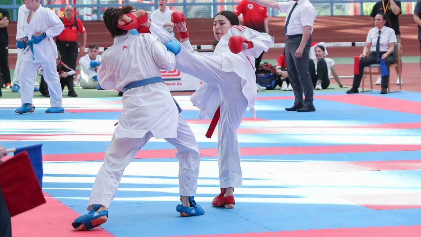Fürth/Erfurt – Am Wochenende 08./09.06.2024 fanden in Erfurt die Deutschen Karate-Meisterschaften der Jugend, Junioren und U21 statt. Für die Teilnahme hatten sich unsere Landeskaderathleten*innen Livia, Michi, Anni und Niklas, sowie unsere Bundeskaderathletin Nastya bei den Bayerischen Meisterschaften in Fürth qualifiziert bzw. wurden vom Landestrainer für dieser Meisterschaften nominiert. Zudem wurden Beata sowie alle übrigen Fürther Starterinnen und Starter für die Auswahl des Bayerischen Karatebundes in Teams der jeweiligen Altersklassen nominiert.